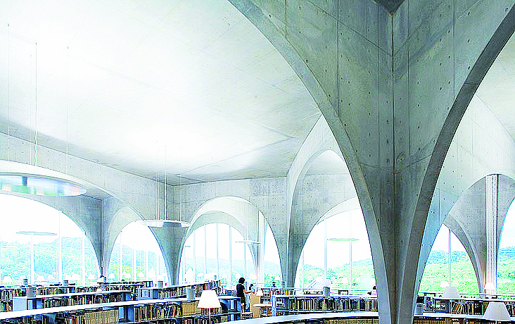 Hệ thống tường bê tông theo cách thiết kế này sẽ rất tự nhiên, các cột lên cao tỏa rộng như tán cây cho không gian đọc cửa sổ lớn. Các không gian không còn tường ngăn, lại một lần nữa ranh giới giữa trong và ngoài nhà, ranh giới giữa thiên nhiên và con người "bị làm mờ đi".