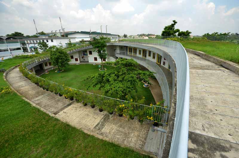 Trường mầm non "Những bông hoa nhỏ" ở Biên Hòa (Đồng Nai) được thiết kế mô phỏng giống hình dáng của loài cỏ ba lá, có không gian gần gũi với thiên nhiên và đầy sắc xanh.